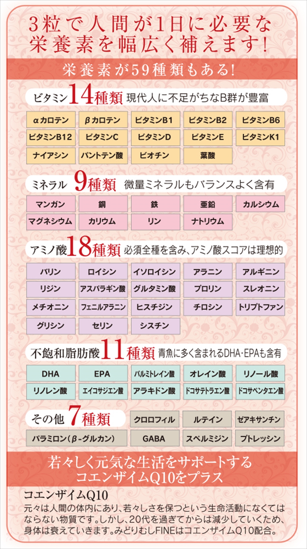 ■ビタミン14種類:αカロテン、βカロテン、ビタミンB1、ビタミンB2、ビタミンB6、ビタミンB12、ビタミンC、ビタミンD、ビタミンE、ビタミンK1、ナイアシン、パントテン酸、ビオチン、葉酸
