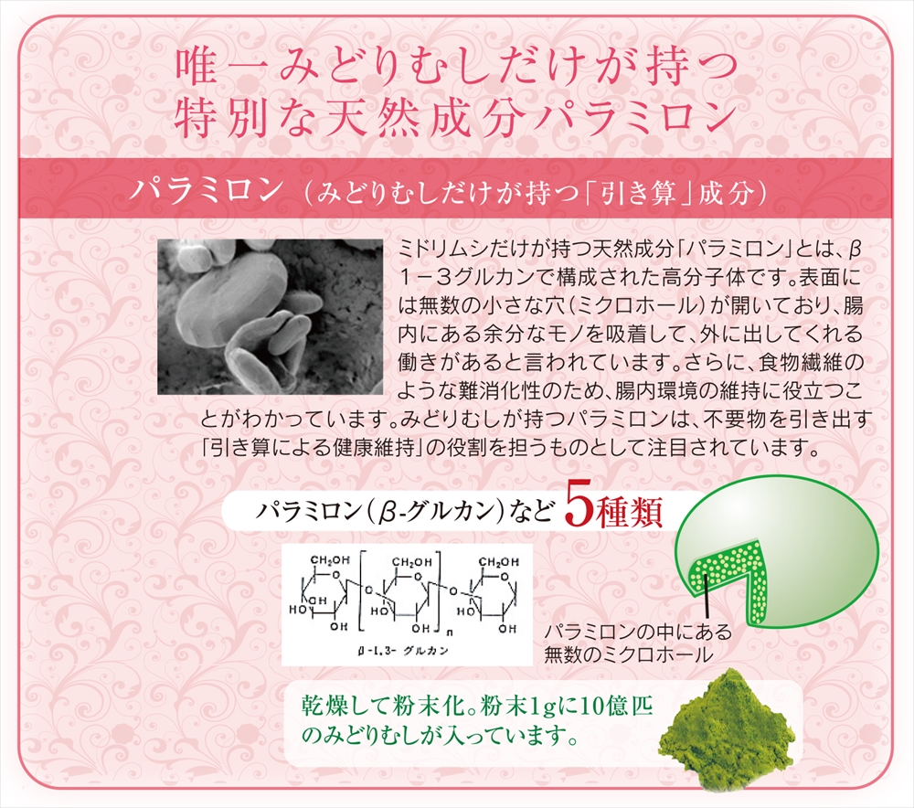 【特徴】動物と植物の両方の性質を持っている藻の一種(植物性と動物性の栄養素59種類を含有)