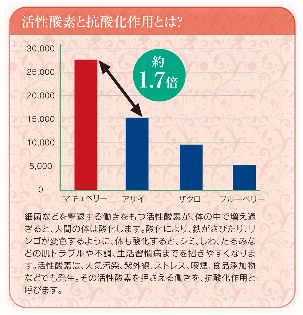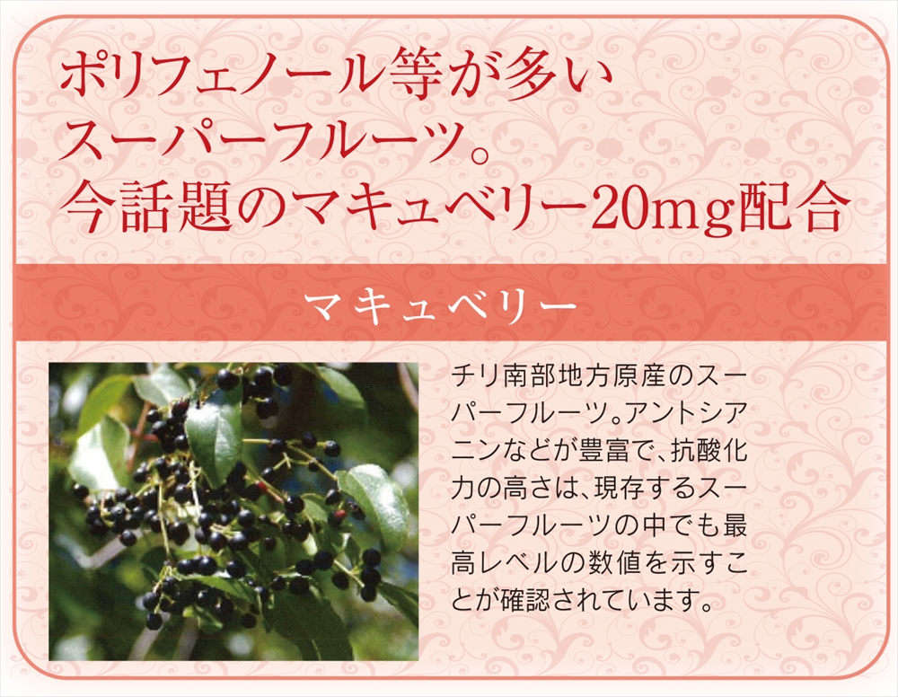 さらに、今話題のマキュベリー配合(アサイーよりも1.7倍の20mg配合のスーパーフルーツ)/コエンザイムQ10も配合。