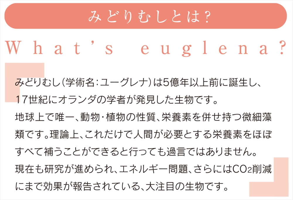 みどりむし(学術名:ユーグレナ)は5億年以上前に誕生し、17世紀にオランダの学者が発見した生物です。地球上で唯一、動物・植物の性質、栄養素を併せ持つ微細藻類です。理論上、これだけで人間が必要とする栄養素をほぼすべて補うことができるといっても過言ではありません。現在も研究が進められ、エネルギー問題、さらにはCO2削減にまで効果が報告されている、大注目の生物です。