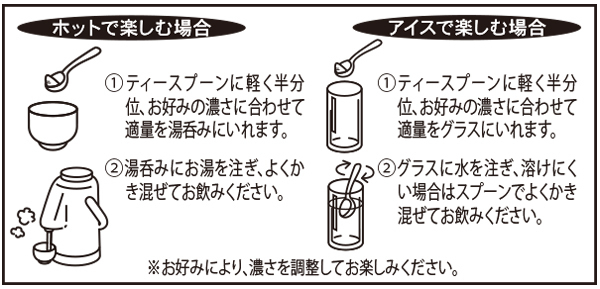 飲み方 : ティースプーンに軽く半分位、湯のみ、グラス等に入れてお湯またはお水を注ぎよくかき混ぜてお飲みください。