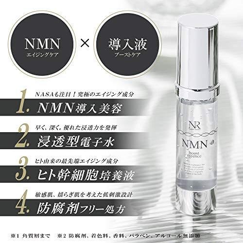 注目のエイジング成分“NMN(ニコチンアミドモノヌクレオチド)”を贅沢配合したブーストエッセンス。特許取得の“高浸透型電子水”を50%使用、使用後2分で実感。話題の成分“ヒト幹細胞エキス”も配合。防腐剤完全無添加+4つの無添加(香料、着色料、パラベン、アルコールを不使用)。頬や目元など気になる部分には重ねづけが効果的。