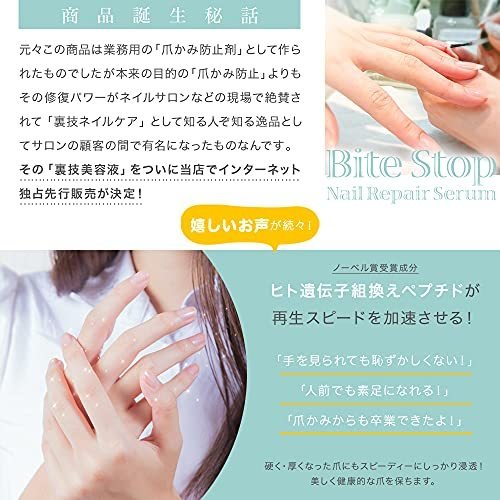 「バイトストップ」は、爪の保護し、爪にうるおいを与え、爪をすこやかに保つ、爪専用美容液です。バイトストップは爪を噛んでしまう癖のある方にもおすすめ。「安息香酸デナトニウム」という苦み成分を配合しているので、無意識の爪噛みにも悩む必要はありません。※幼児にも使えます。1日1回睡眠前に塗るだけなので、手軽に爪美容が可能です!