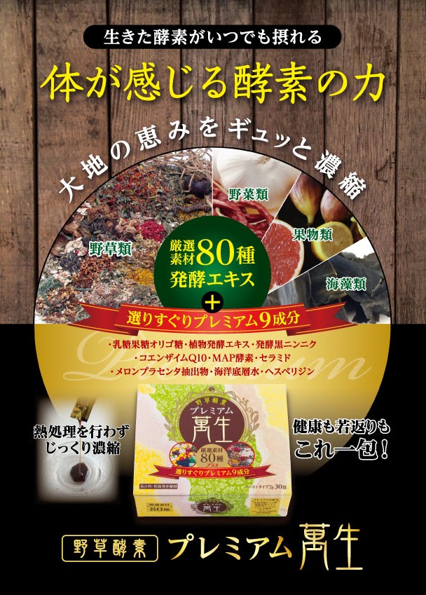 原材料名:野草類エキス(ヨモギ、ウコン、ドクダミ、キダチアロエ、高麗人参、センシンレン、オトギリソウ、クマザサ、タンの根、霊芝、アマチャヅル、トチュウ葉、オオバコ、甘草、マツ葉、ナンテンの葉、アマドコロ、ツユ草、ツルナ、マカ、トンカットアリ、ハブ草、ハト麦、スギナ、ビワ葉、ラカンカ、クコの実、レイセンソウ、モモの葉、イチョウ葉、ニンドウ、イチジクの葉、ベニバナ、エゾウコギ、エンメイ草、モロヘイヤ、セッコツボク、アカメガシワ、クコ葉、カキの葉、カミツレ、カリン、シソ葉、桑葉、メグスリの木、田七人参、キキョウ根、ナツメ、サラシア、マタタビ、エビス草の種子、紅参、アガリクス、ルイボス、アムラの実、タマネギ外皮、キャッツクロー)、